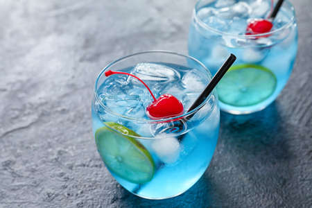 Glasses of Blue Lagoon cocktail on dark background