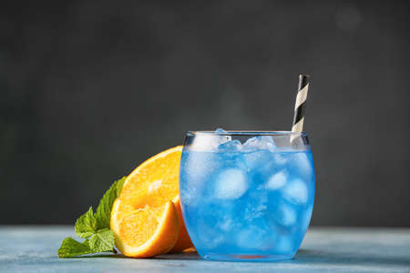 Glass of Blue cocktail on gray background