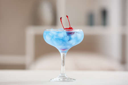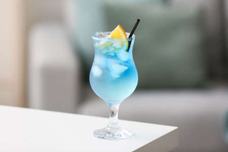 Glass of Blue cocktail on table in room