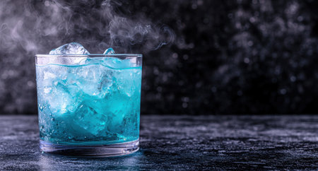 Refreshing blue cocktail with ice and smoke
