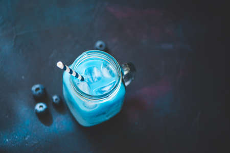 Glass of iced Butterfly Pea flower tea with milk. Top view.
