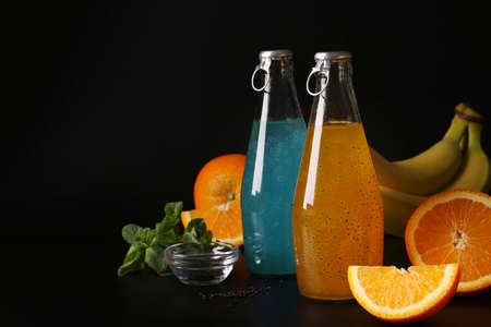 Trendy tropical blue and orange drink with basil seeds in bottle on black background, Closeup, Copy space