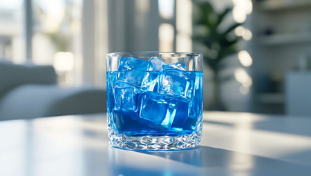 Glass of blue water with ice cubes on table in modern living room