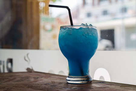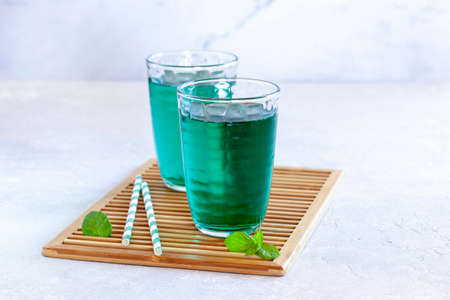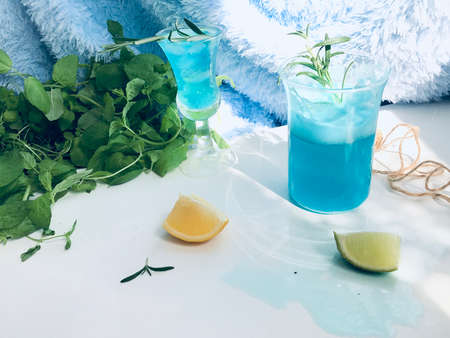 Blue cold drink in a glass with ice cubes on white desk with blue background. Also used mint leaves and rosemary, rope, spoon with natual sunlight from the open window