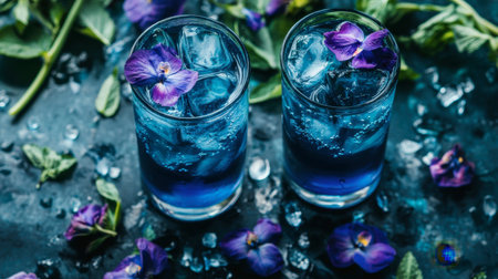 Two glasses filled with a refreshing blue beverage surrounded by ice and edible flowers, capturing a vibrant, stylish, and relaxing summertime aesthetic perfect for parties.