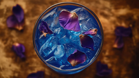 A stunning top view of a vibrant blue drink garnished with purple petals and ice, showcasing elegance and creativity. Perfect for summer parties or special occasions.