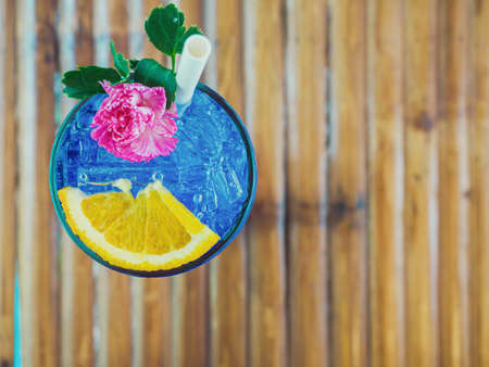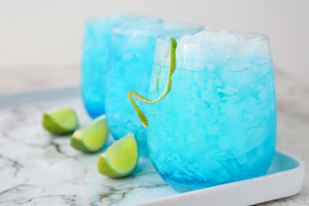 summer drink concept from blue Hawaiian drink with lemon topping. Drink for hot summer days.