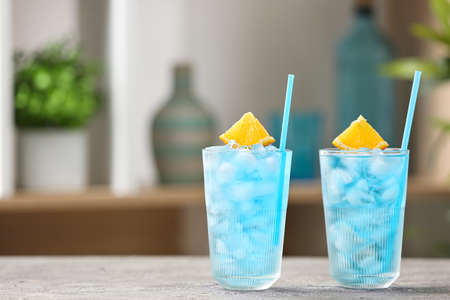 Glasses of Blue Lagoon cocktail on table indoors