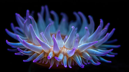 close-up of coral polyps capturing plankton in the dark, created with generative ai