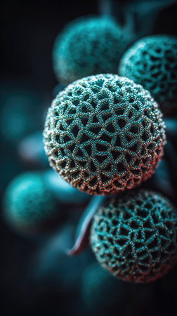 This image showcases spherical objects with a detailed, textured surface. The composition features a shallow depth of field, emphasizing the intricate patterns and structures within each sphere. The color palette includes shades of teal and green. This image can be suitable for various commercial purposes.