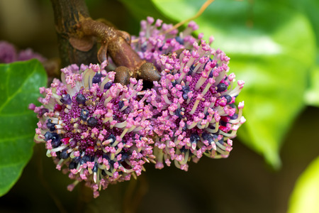 Miagos Bush flower (Osmoxylon lineare) blooming in shallow focus, a popular shrub cultivated as hedges and house plants.