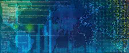 Abstract Business Information Technology background concept. Code Programming, Digital Binary and World map in blue color background. Panoramic Horizontal Design and Copy space.