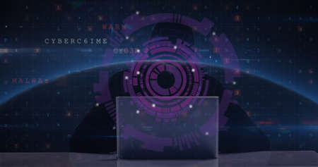 Image of data processing over integrated circuit and caucasian male hacker. Global data safety, hackers attack and technology concept digitally generated image.