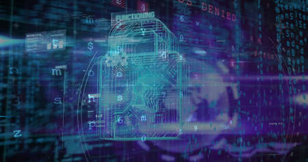 Image of warning data processing, online security padlock and circuit board. global online security, computing, data processing and technology concept digitally generated image.