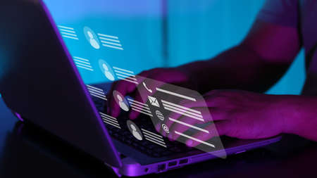 User typing on a laptop with virtual screen of directory contact. Concept for contact us.