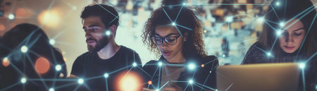 Diverse individuals engaged in collaborative work, utilizing technology to connect and innovate in a modern workspace.