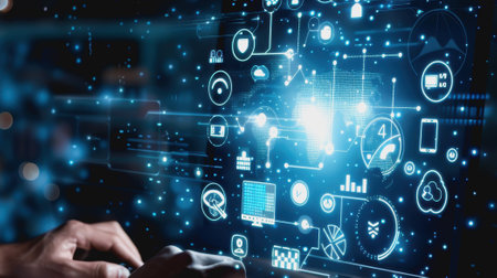 Innovative digital interface interaction tech hub visual display modern workspace close-up user engagement