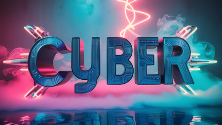 Cyber title text word made from burning electronic components, printed on motherboard PCB with much light and electric signals around. High quality illustration