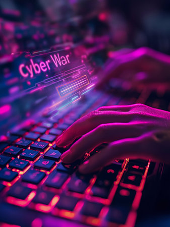 Close-up image of a cyber warrior's hand using a hi-tech holographic glowing pink light keyboard on a phone to fight in the cyber war.