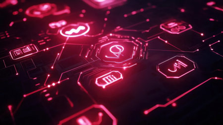 A vibrant digital interface showcasing intricate neon red circuitry and tech icons, representing themes of data analytics, innovation, and advanced technology in a modern environment.