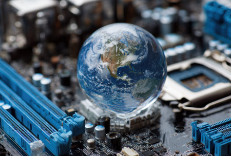 Miniature Earth globe rests atop a detailed computer circuit board, symbolizing technology's impact