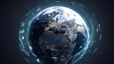 Planet earth showing city lights across continents, surrounded by an abstract digital data network ring representing global communication, technology, and interconnected information