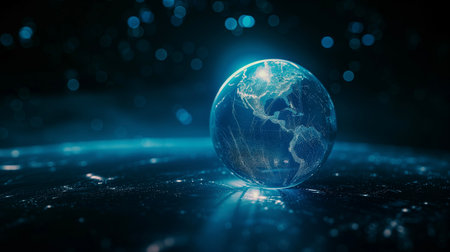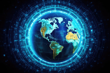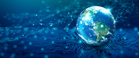 A digital illustration features a translucent globe hovering above a complex circuit board. The globe showcases continents with a blue hue, while the board displays intricate circuits and a cool color palette. The image conveys a futuristic technological concept, suitable for diverse commercial and editorial applications.
