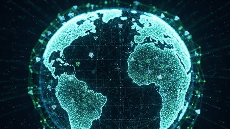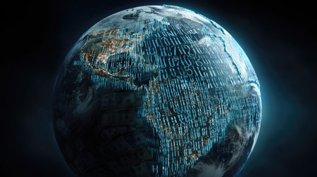 A captivating digital representation of Earth covered in binary code, highlighting global connectivity and technology's influence in a dark, atmospheric setting.