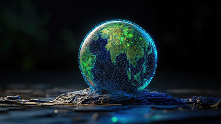 A stunning digital globe representation, showcasing a glowing mesh of Earth on a textured rocky surface, ideal for themes of technology and environment.
