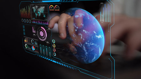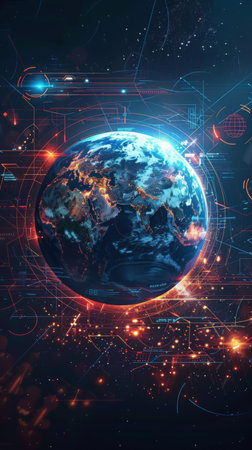 surface of earth planet with futuristic computer technology and mega city, digital connections with hologram and glow against background of space, concept of globalization and urbanization