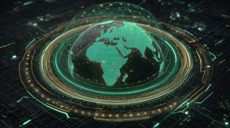 Futuristic Digital Globe with Data Connection and Network Visualization of Africa and Europe in Cybernetic Style
