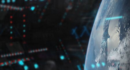 View of blue planet Earth from a space station window during a sunrise 3D rendering