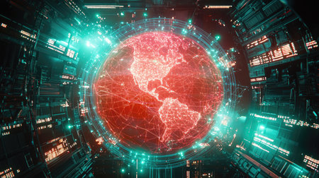 High-tech global network connection interface showing worldwide digital communication, data exchange, and internet connectivity. Global connection, data interaction, and worldwide communication. Thunk