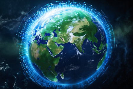 Digital information field on a planetary scale. Information network surrounds the entire planet. Concept of futuristic communication technologies.