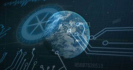 Image of data processing, globe spinning with computer circuit board in background. global data processing and digital interface concept digitally generated image.
