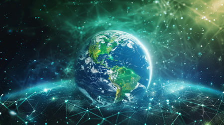 Digital view of Earth from space with glowing network connections representing global communication. Perfect for technology and digital themes.