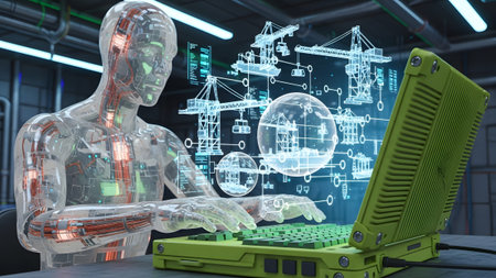 Laptop showing transparent cyborg man using futuristic laptop with holographic construction...