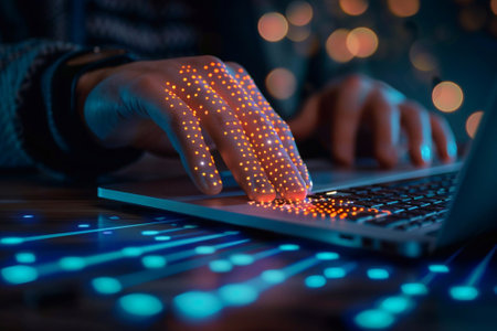 Laptop with hands of hacker and polygonal lines on dark background, view of notebook and digital data. Theme of computer technology, privacy, network, cyber security, hack, information. Generative AI