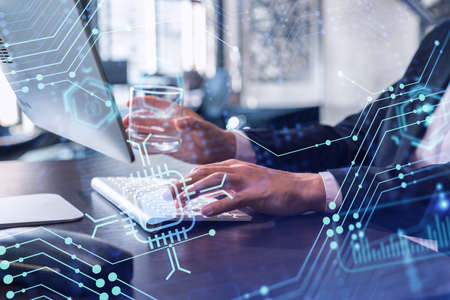 Multi exposure of data internet theme hologram with man working on computer on background. Concept of innovation.