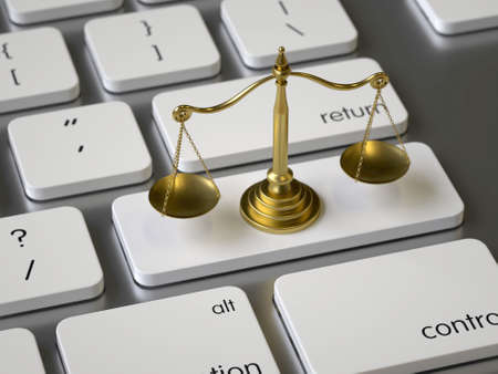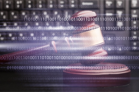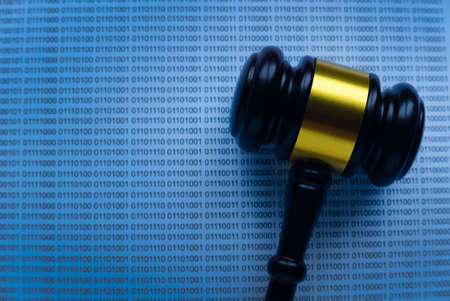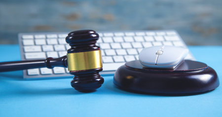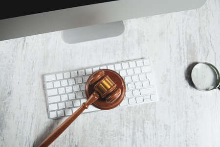 Gavel at the computer keyboard: Legal and law concept. Wooden hammer of justice and order