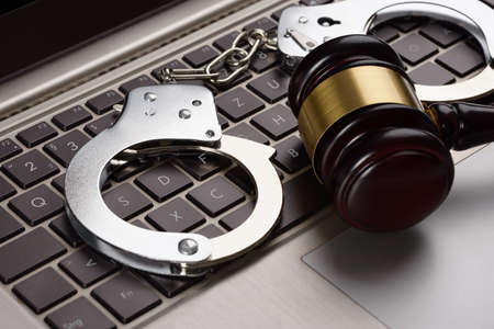 Handcuffs and gavel on a laptop. Cyber crime, online piracy and internet web hacking concept