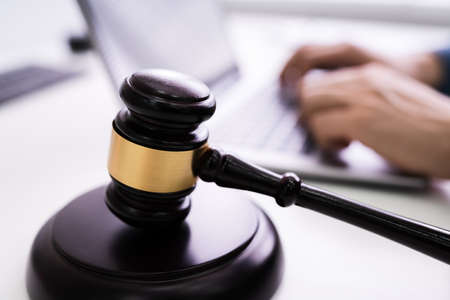 Close-up Of A Businessperson's Hand Using Laptop With Gavel On Desk