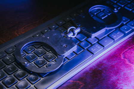 Handcuffs placed on a keyboard, representing the intersection of crime and technology, with moody lighting enhancing the scene's intensity and evoking a sense of urgency