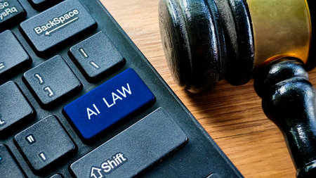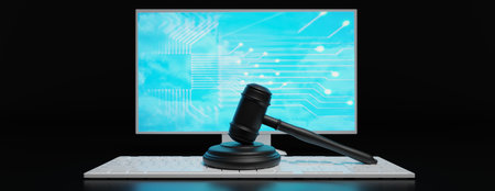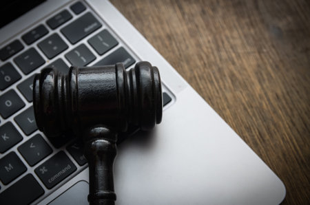 A judge's gavel rests on a modern laptop keyboard, symbolizing the critical intersection of law, technology, and online regulation in the digital age.