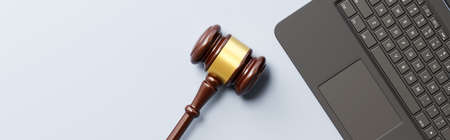 Judges Gavel and Laptop Computer on Gray Background with Copy Space