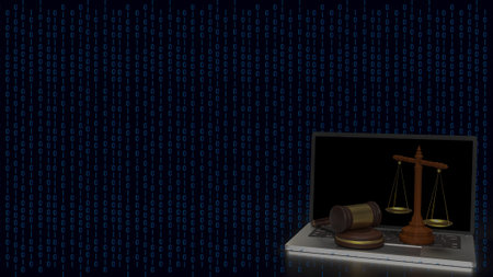 A holographic scale of justice appears on a laptop, illustrating the fusion of law and technology in modern society.
