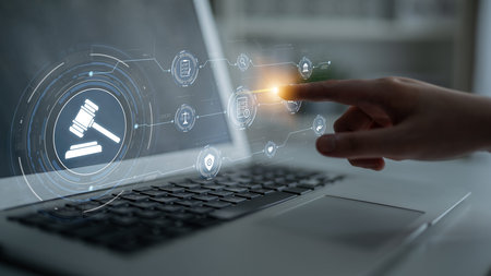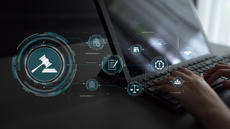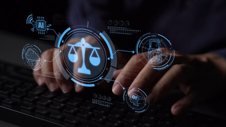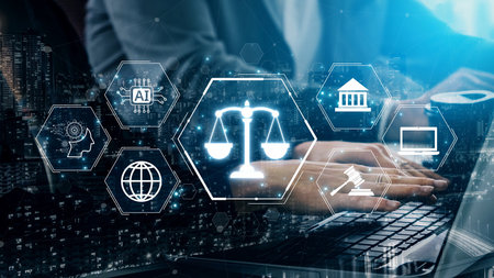 AI in global online legal services and cyber law. Digital platform using AI for legal consultation, justice, and regulatory compliance. Motif