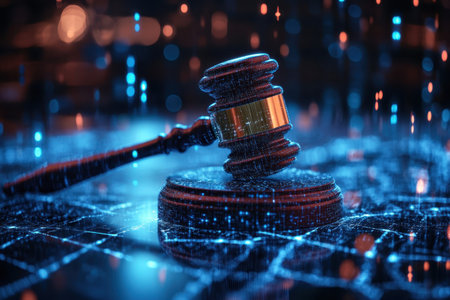 A gavel sits on a glowing circuit board, symbolizing technology and law in a modern environment.