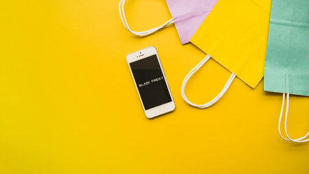 Smartphone on yellow background. Online shopping concept.