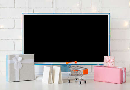 Online shopping concept. computer monitor and gifts and shopping for Christmas.